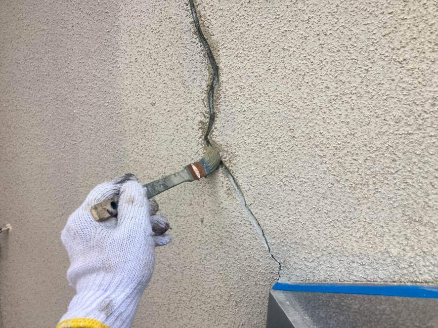 クラックの幅や深さを確認し、周囲の汚れや浮いた塗膜を除去します。