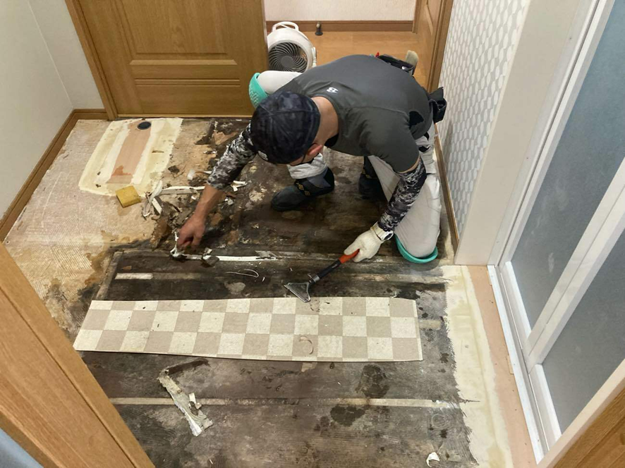 写真は脱衣所の古いクッションフロアを撤去したところです。
