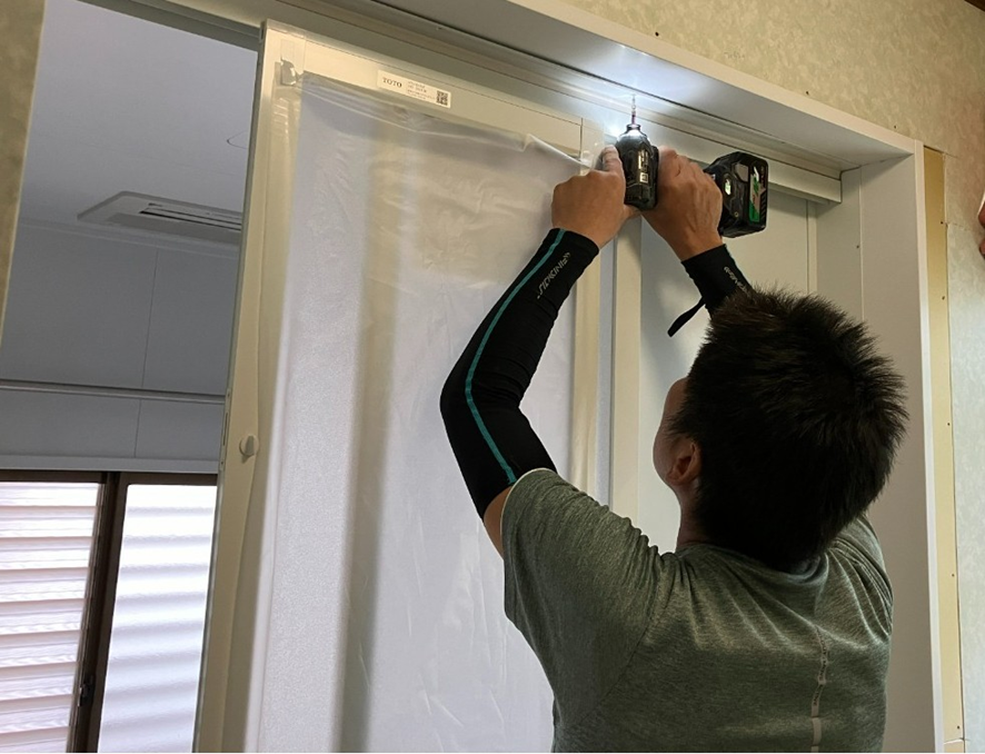 写真は浴室の入口を取付けしているところです。