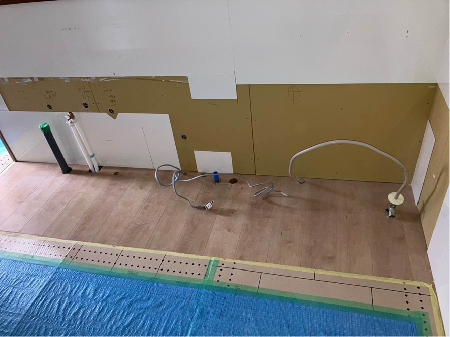 写真は既存のキッチンを撤去し、給水・排水・電気配線を移設した様子になります。