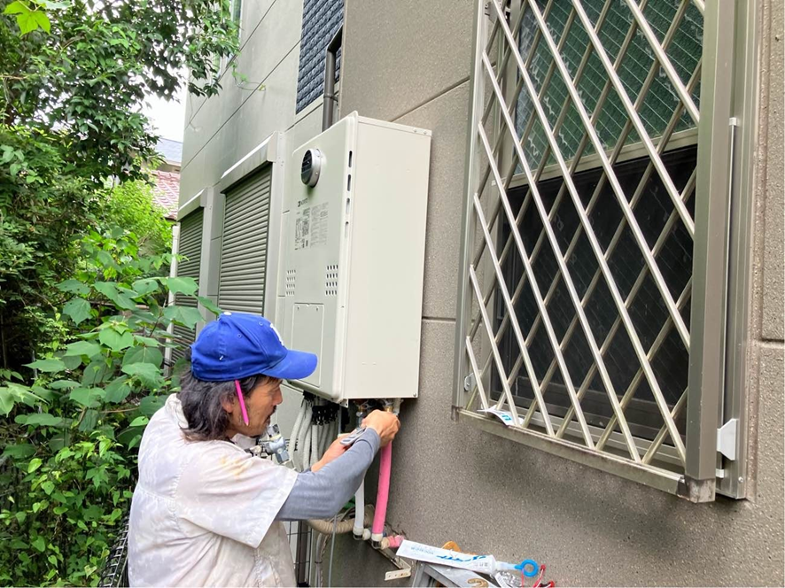 写真は新しい給湯器を設置して配管を接続している様子です。